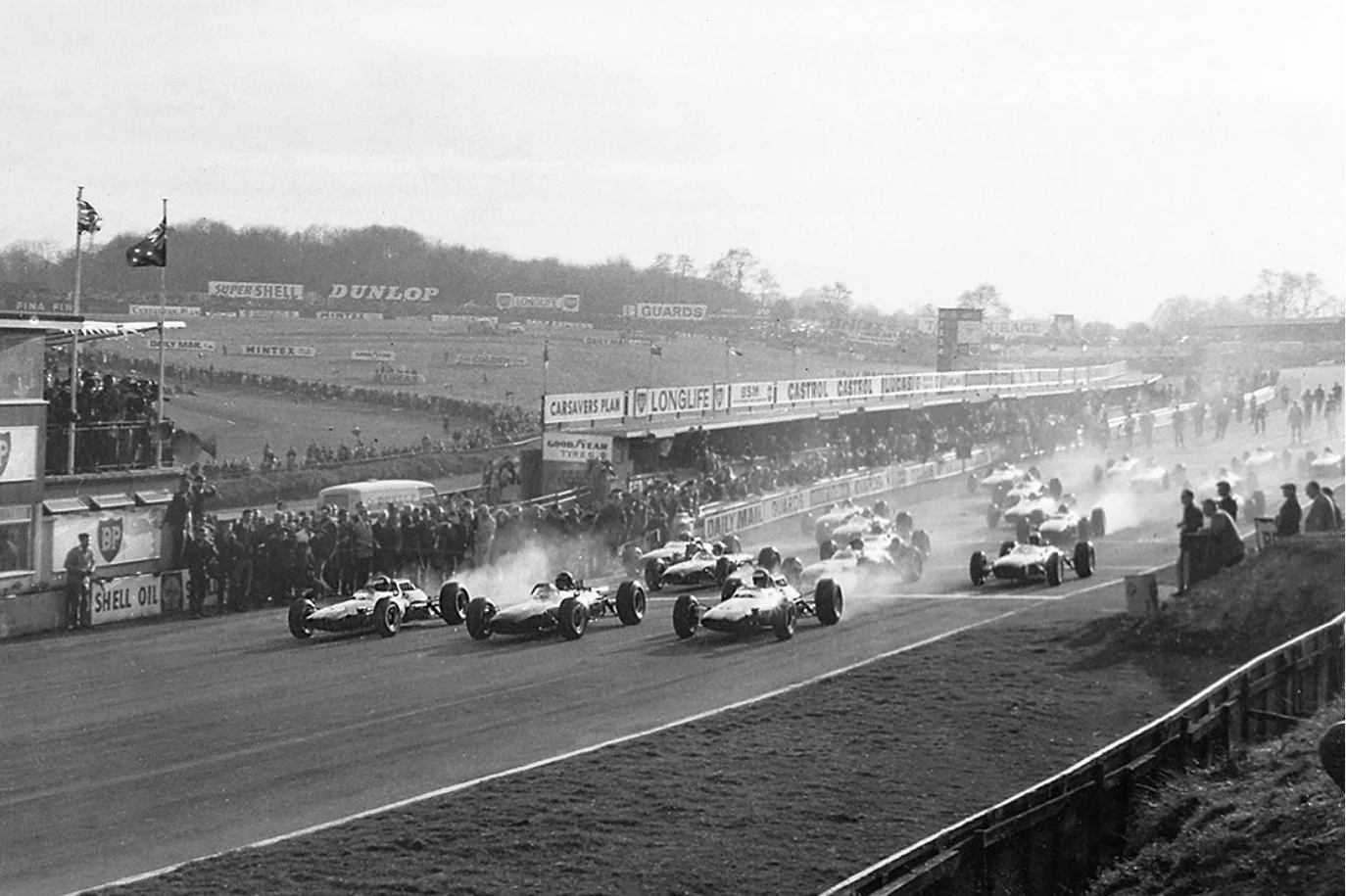 The track was surfaced in 1950, extended through the woods in 1960, and by 1964 it was ready for Formula One. Jim Clark won the first British Grand Prix held here. Jack Brabham, Sir Stirling Moss, Jo Siffert, Niki Lauda, James Hunt, and Ayrton Senna all followed.